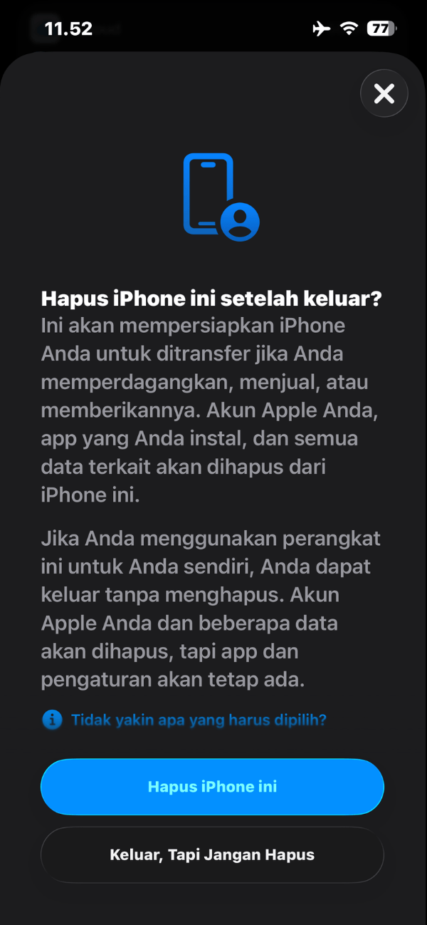 Dua opsi ini biasanya muncul saat kamu sedang keluar dari akun Apple di iPhone. Sederhananya, sistem sedang menanyakan apakah perangkat ini ingin disiapkan untuk berpindah tangan, atau hanya ingin keluar dari akun tetapi tetap dipakai sendiri.
