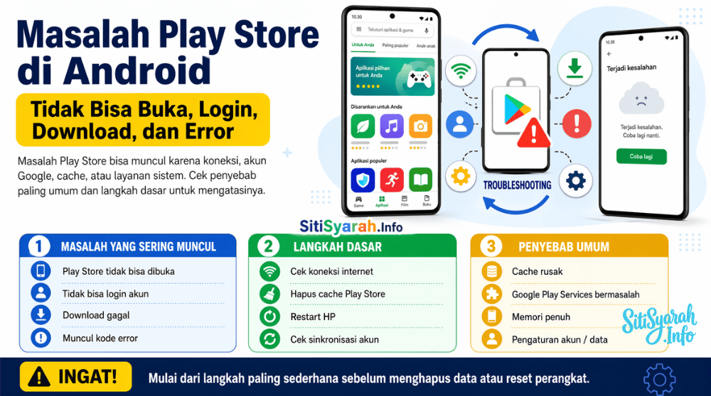 Masalah Play Store di Android sebenarnya bisa dibagi ke beberapa kelompok besar, yaitu tidak bisa buka, tidak bisa login, tidak bisa download, muncul kode error tertentu, atau masalah pembayaran operator. Walau gejalanya berbeda-beda, akar masalahnya sering berputar di internet, akun Google, cache Play Store, Google Play Services, dan sistem Android.