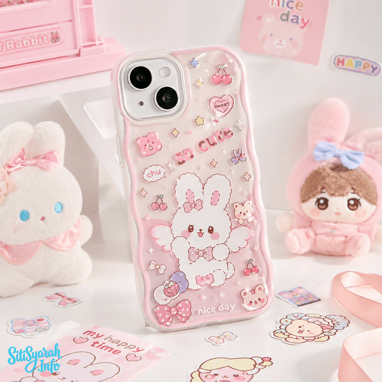 Foto produk casing HP dengan motif lucu, ditemani boneka mini, pita, dan stiker pastel di sekitarnya, latar belakang putih atau pastel lembut, pencahayaan cerah merata, gaya cute kawaii, sangat menggemaskan dan cocok untuk Gen Z.