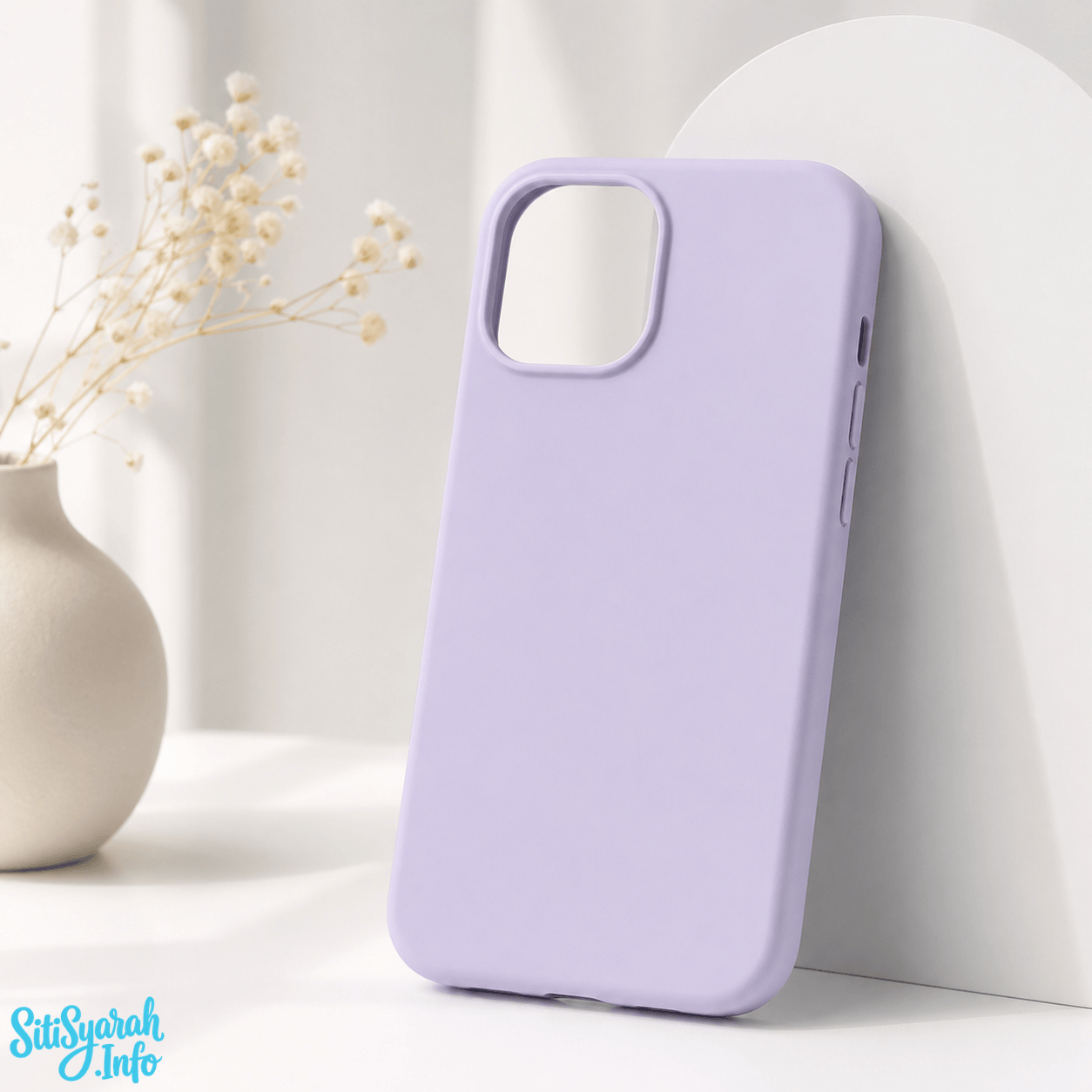 Foto produk casing HP silikon warna lavender pastel, diletakkan di atas meja putih minimalis, soft studio lighting, background clean, detail tekstur silikon terlihat jelas, cocok untuk katalog Shopee.